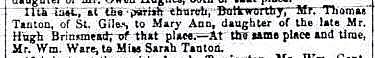 The 1841 census shows Mary Brinsmead living at Stoneyford, which is a farm in St. Giles, with children Mary (4) and Hugh (2). Also living with them are Elizabeth Turner (20), William Turner (15), (presumably Mary's younger brother and sister), William Copp, John Quick and Thomas Lander. Mary is shown as a Miller and Elizabeth as a Glove Maker.