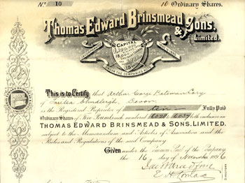 An original share certificate in T. E. Brinsmead and Sons Ltd. from the editor's collectionArmed with that legal status, Richardson,, as a "straw man" on behalf of the John Brinsmead and Sons' firm interests, commenced yet more court proceedings, this time to have a receiver appointed to prevent the proceeds of the share sales being siphoned off and for an order winding up the new company on the basis that it was insolvent. These proceedings, which became complex and protracted, are explained in more detail below. Eventually, a winding up order was made on December 3rd, 1896. That order was then appealed to the English Court of Appeal.