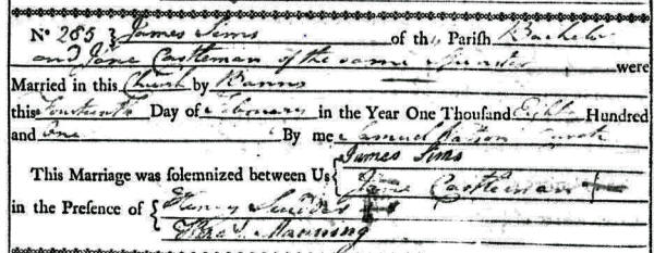 James Sims married Jane Castleman at the parish church in Plumstead, Kent, on February 14th, 1801.