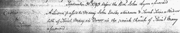 We know Robert died before 1793, because in that year Sarah Sims, widow, married a widower named John Eastes, by Bishop’s licence. We are almost certain this is our Sarah, since Mary Baker and Thomas Curling are the witnesses on the marriage certificate and they also witnessed her earlier marriage to Robert Sims. A 1972 Dover Directory lists a John Eastes as a Baker.